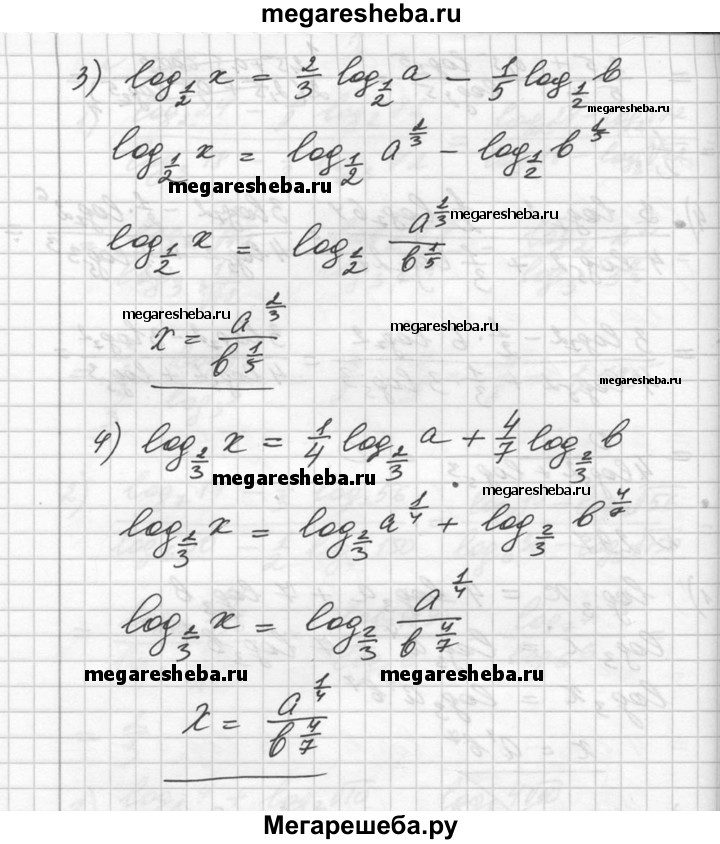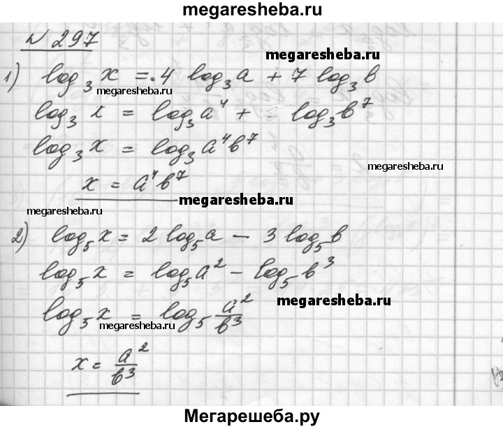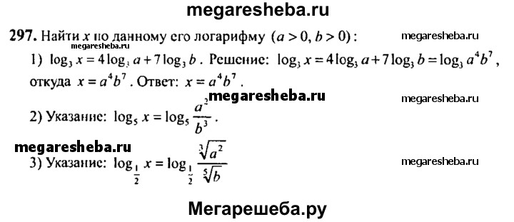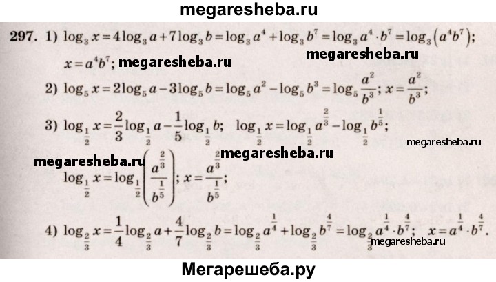 297. Найти х по данному его логарифму (а > О, Ь > 0): 1) log3 х = 4 log3 а + 7 log3 b; 2) log5 x = 2 log5 a - 3 log5 b; 3) log1/2 x = 2/3 log1/2 a- 1/5 log1/2 b; 4) log2/3 x = 1/4 log2/3 a + 4/7 log2/3 b.