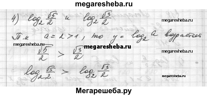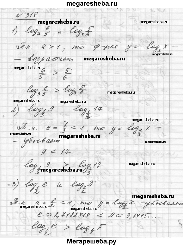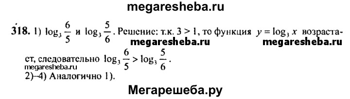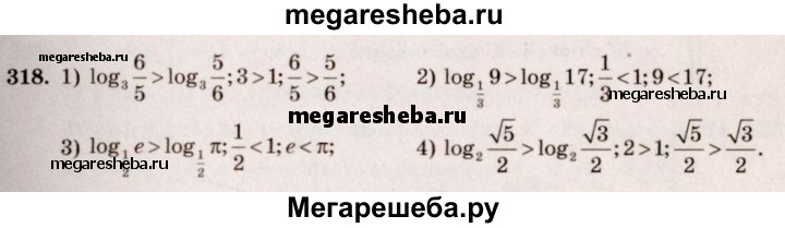 318. Сравнить числа: 1) log3 6/5 и log3 5/6; 2) log1/3 9 и log1/3 17; 3) log1/2 е и log1/2 π; 4) log2 √5/2 и log2 √3/2.
