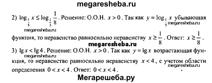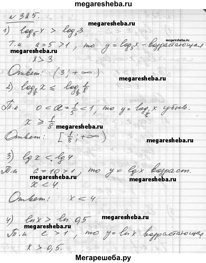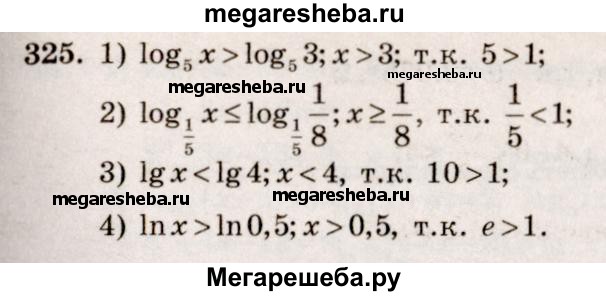 Решить неравенство (325—326). 325. Решить неравенство 1) log5 x > log5 3; 2) log1/5 х ≤ log1/5 1/8I; 3) lg x < lg 4; 4) In x > In 0,5.