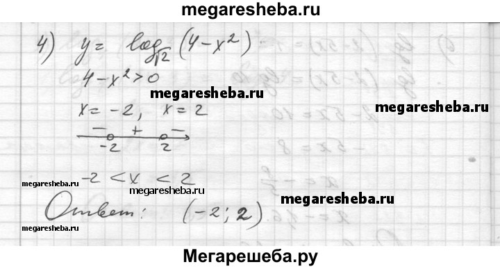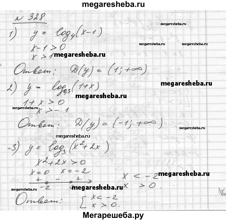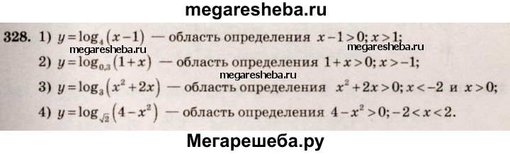 328. Найти область определения функции: 1) y = log4 (х - 1); 2) у = log0,3 (1 + x); 3) у = log3 (х^2 + 2х); 4) у = log√2 (4 – х^2).