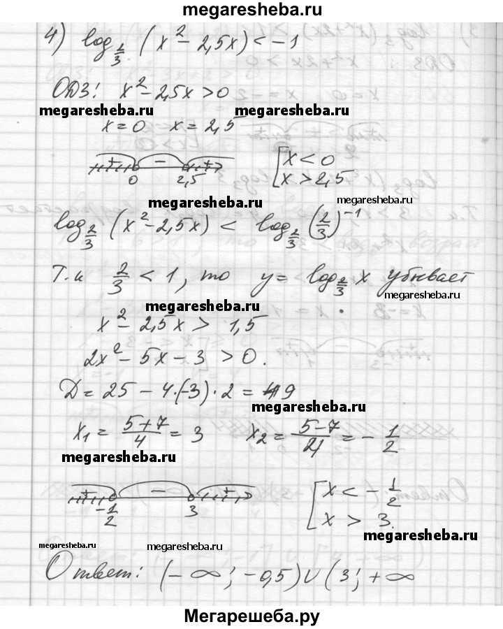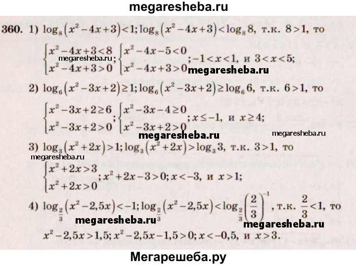 360. Решить неравенство 1) log8 (х^2 - 4х + 3) < 1; 2) log6 (x^2-3x+2) ≥ 1; 3) log3 (х^2 + 2х) > 1; 4) log2/3 (x^2-2,5x) < -1.