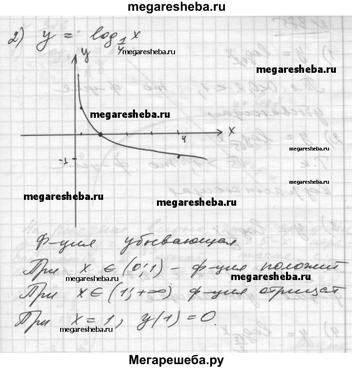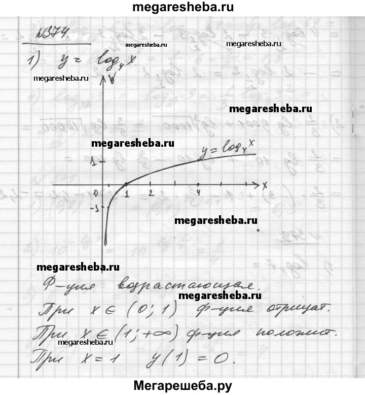 374. Построить график функции: 1) y = log4 х; 2) y = log1/4 x. Какая из данных функций является возрастающей? убываю¬щей? При каких значениях х каждая функция принимает положительные значения? отрицательные значения? значе¬ния, равные нулю?