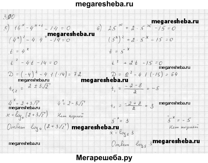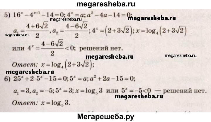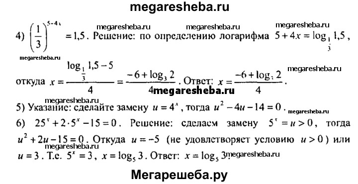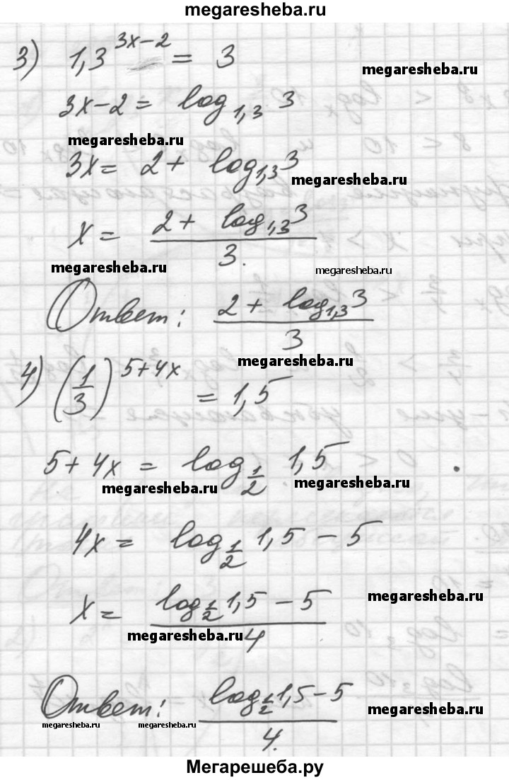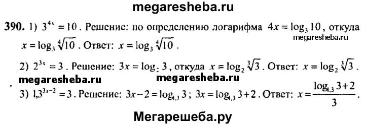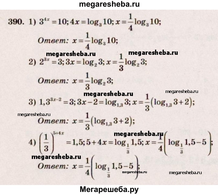 390. Решить уравнение 1) 3^4х = 10; 2) 2^3х = 3; 3) 1,3^3х-2 = 3; 4) (1/3)^5+4x =1,5; 5) 16^х – 4^x+1 - 14 = 0; 6) 25^х + 2 * ^x - 15 = 0.