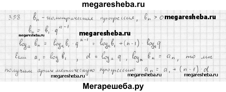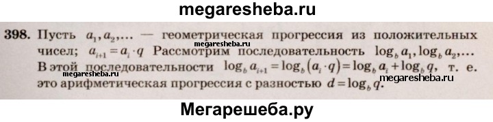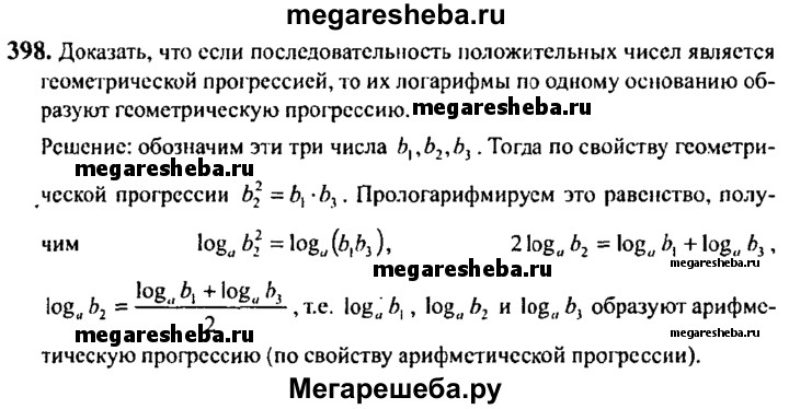 398. Доказать, что если последовательность положительных чи¬сел является геометрической прогрессией, то их логарифмы по одному и тому же основанию образуют арифметическую прогрессию.
