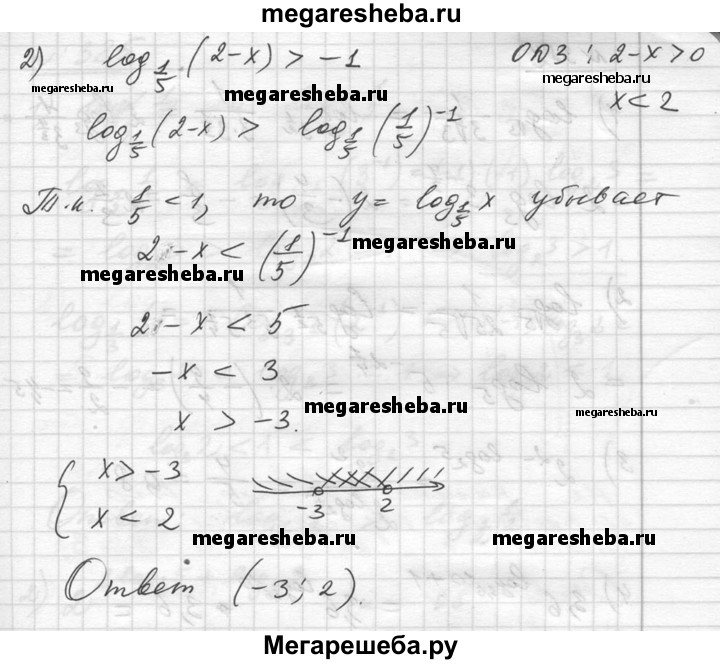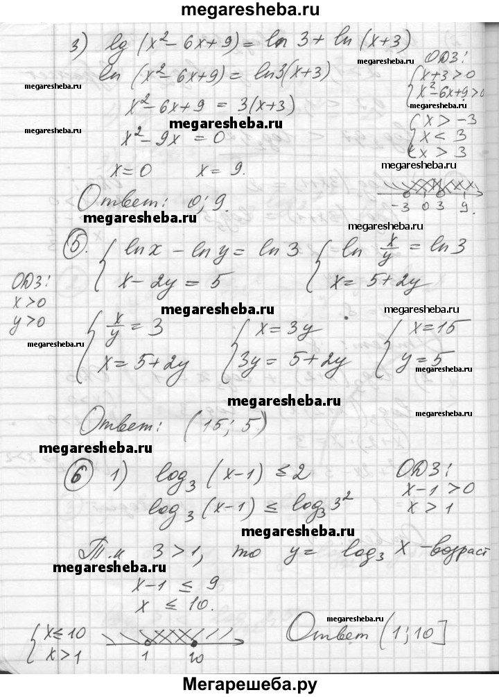 1. Вычислить: 1) log5 125; 2) lg 0,01; 3) 2^log2 3; 4) 3^2log3 7; 5) log2 68 - log2 17. 2. Построить схематически график функции: 1) y = log0,2 x; 2) у = log2 х. 3. Сравнить числа: 1) log0,2 3 и log0,2 2,5; 2) log2 0,7 и log2 1,2. 4. Решить уравнение: 1) log5 (Зх + 1) = 2; 2) log3 (х + 2) + log3 х = 1; 3) In (х^2 - 6х + 9) = In 3 + In (х + 3). 5. Решить систему уравнении 6. Решить неравенство: 1) log3 (х - 1) ≤ 2; 2) log1/5 (2 - х) > —1.