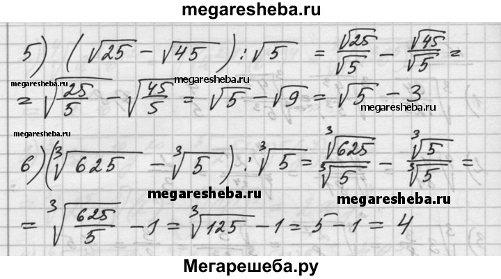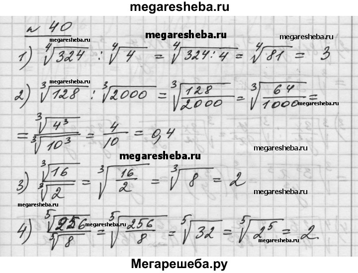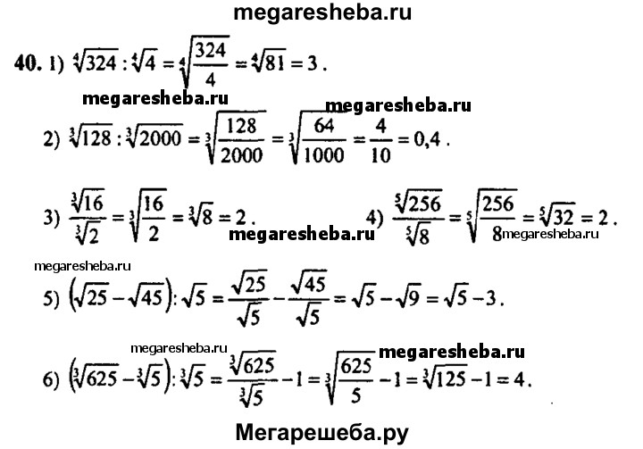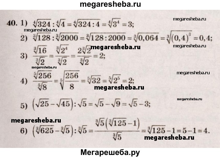 40. Вычислить 1) ^4√324 : ^4√4; 2) ^3√128 : ^3√2000; 3) ^3√161/ ^3√2; 4) ^5√256 / ^5√8; 5) (√25-√45): √5; 6) (^3√б25 - ^3√5): ^3√5.