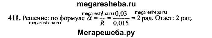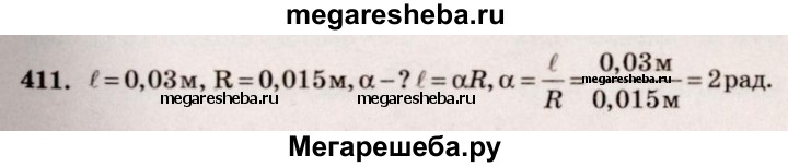 411. Найти радианную меру угла, который соответствует дуге окружности длиной 3 см, если радиус окружности равен 1,5 см.