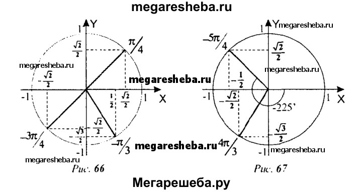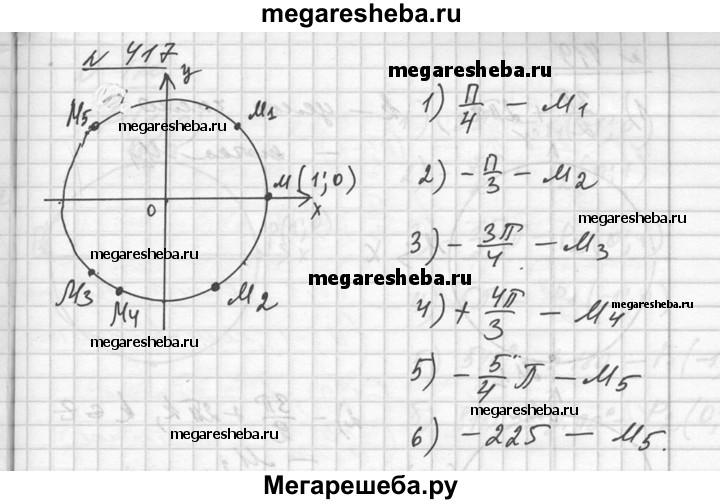 417. На единичной окружности построить точку, полученную поворотом точки (1; 0) на заданный угол 1) π/4; 2) – π/3; 3) -3/4π; 4) 4 π/3; 5) -5/4 π; 6) -225°.