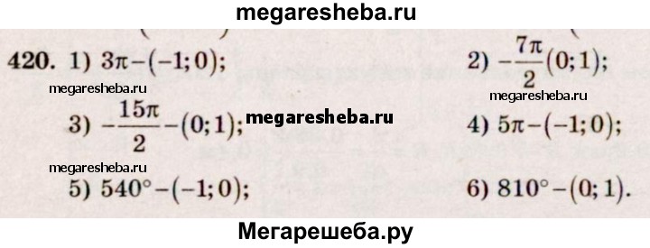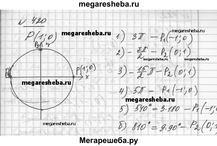 420. Найти координаты точки, полученной поворотом точки Р (1; 0) на угол: 1) З π; 2) – 7/2 π; 3) -15/2 π ; 4) 5 π; 5) 540°; 6) 810°.