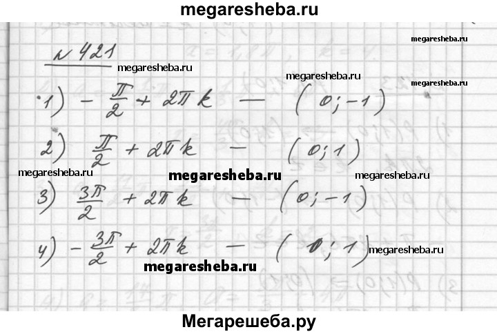 421. Найти координаты точки, полученной поворотом точки Р (1; 0) на угол (k — целое число): 1) – π/2 ± 2 πk; 2) π/2 ± 2 πk; 3) 3 π/2 + 2 πk; 4) -3 π/2 + 2 πk.