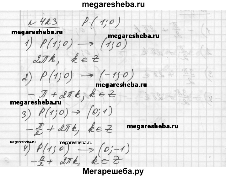 423. Найти все углы, на которые нужно повернуть точку Р (1; 0), чтобы получить точку с координатами: 1) (1; 0); 2) (-1; 0); 3) (0; 1); 4) (0; -1).