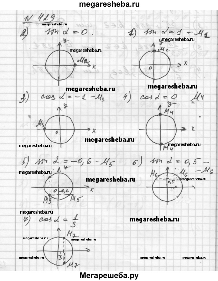 429. Отметить на единичной окружности точки, соответствующие числу α, если: 1) sin α = 1; 2) sin α = 0; 3) cos α = 0; 4) sin α = -0,6; 6) sin α = 0,5; 7) cos α = 1/3;