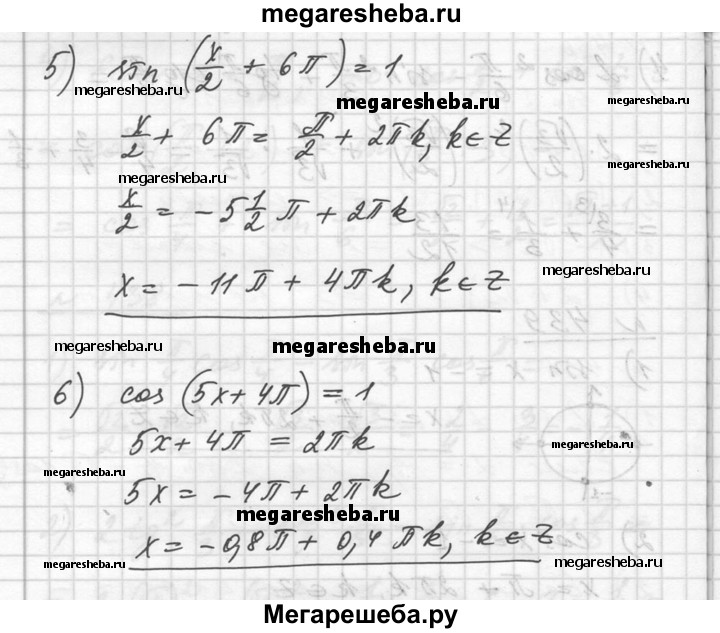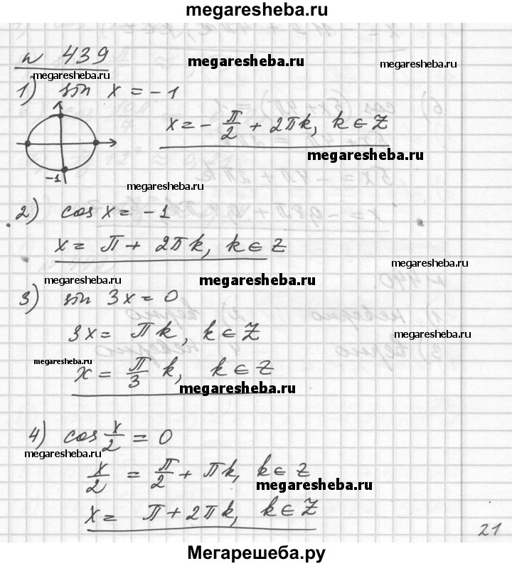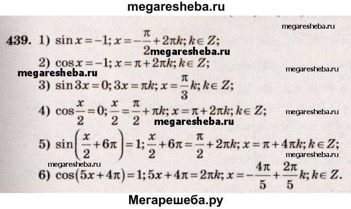 439. 1) sin x = - 1; 2) cos x = -1; 3) sin 3x = 0; 4) cos0,5x = 0; 5) sin (x/2 + 2π/3) = 1; 6) cos (5x + 4π/5) = 1.