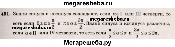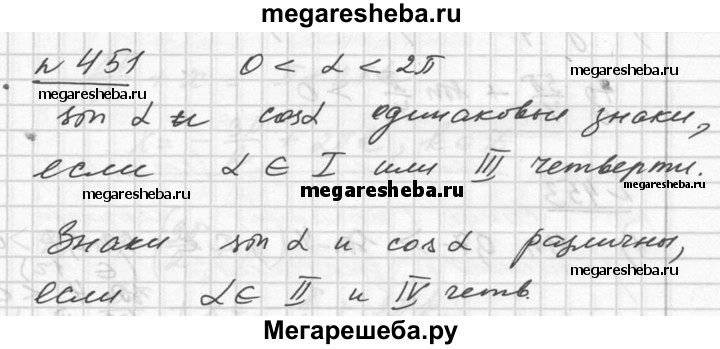 451. Найти значения углов a, заключённых в промежутке от 0 до 2π, знаки синуса и косинуса которых совпадают; различны.