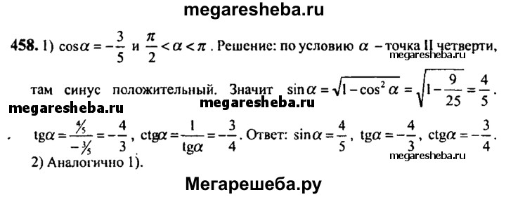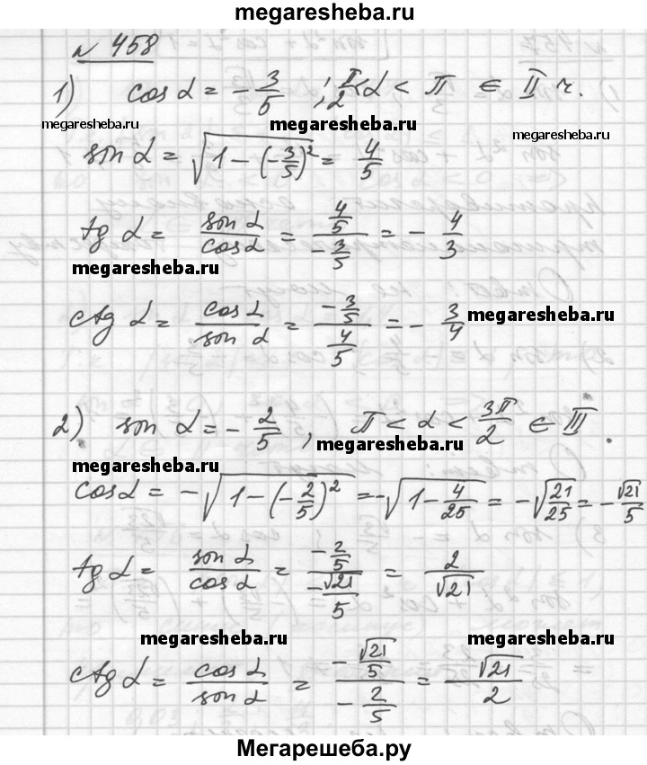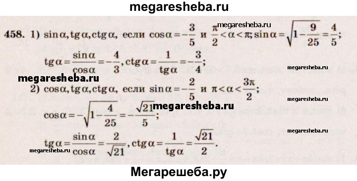 458. Вычислить: 1) sin α, tg α и ctg α, если cos α = - 3/5 и π/2 < a < π; 2) cos α, tg α и ctg α, если sin α = - 2/5 и π < α < 3π/2.