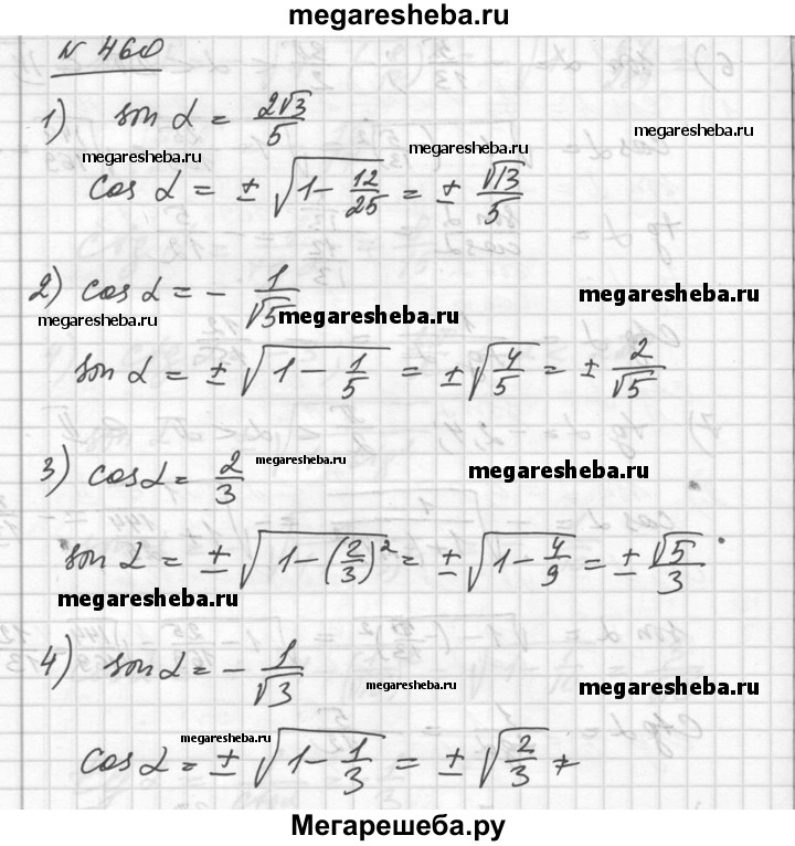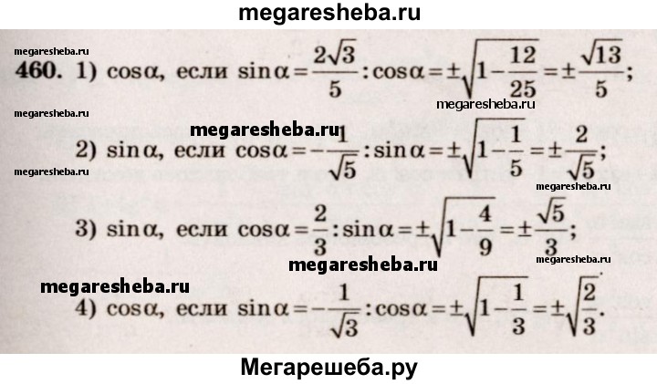 460. Какие значения может принимать: 1) cos α, если sin α = 2√3/5; 2) sin α, если cos α = - 1/√5; 3) sin α, если cos α = 2/3; 4) cos α, если sin α = - 1/√3?