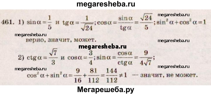 461. Могут ли одновременно выполняться равенства: 1) sin α = 1/5 и tg α = 1/√24; 2) ctg α = √7/3 и cos α = 3/4 ?