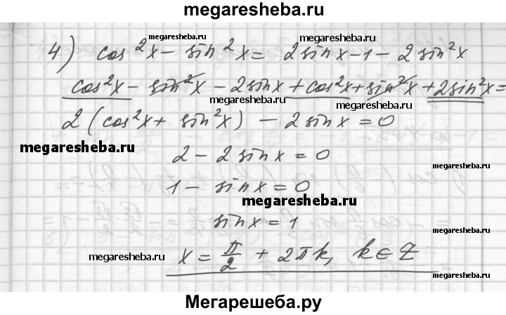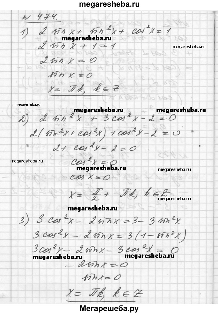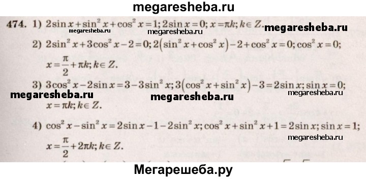 474. Решить уравнение: 1) 2 sin x + sin^2 x + cos^2 x = 1; 2) 2 sin^2 x + 3 cos^2 x -2 = 0; 3) 3 cos^2 x-2sinx = 3 - 3 sin^2 x; 4) cos^2 x – sin^2 x = 2sinx – 1 -2 sin^2 x.