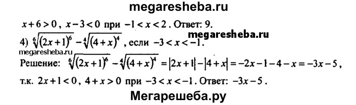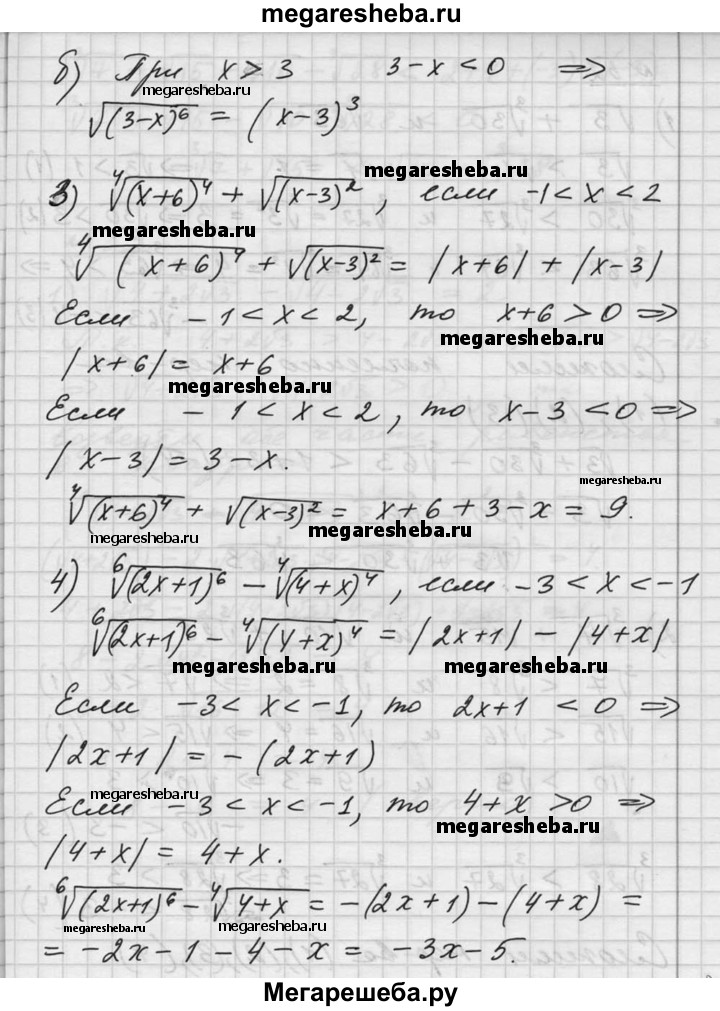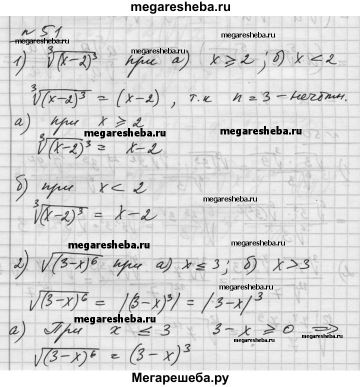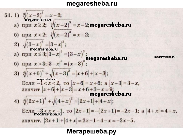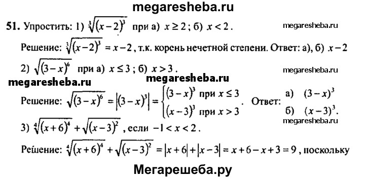51. Упростить: 1) ^3√ (х-2)^3 при: a) x ≥ 2; б) х < 2; 2) √(3-х)^6 при: а) х ≤ 3; б) х > 3; 3) ^4√ (x + 6)^4 + √ (x-3)^2 , если -1 < х < 2; 4) ^6√ (2х + 1)^6 - ^4√ (4+х)^4 , если -3 < х < -1.