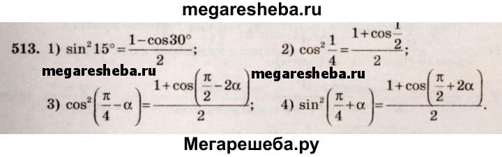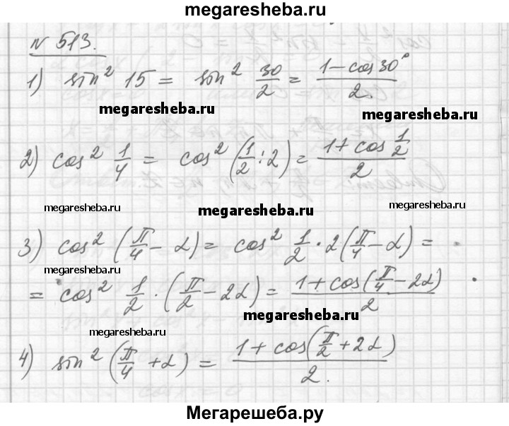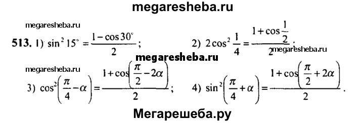 513. Выразить квадрат синуса (косинуса) заданного угла через косинус угла, в два раза большего: 1) sin^2 15°; 2) cos^2 1/4; 3) cos^2 (π/4 - α); 4) sin^2 (π/4 + α).