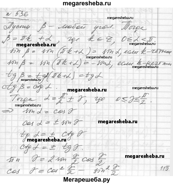 536. Доказать, что вычисление значений синуса, косинуса и тан¬генса любого угла можно свести к вычислению их значений для угла, заключённого в промежутке от 0 до π/4.