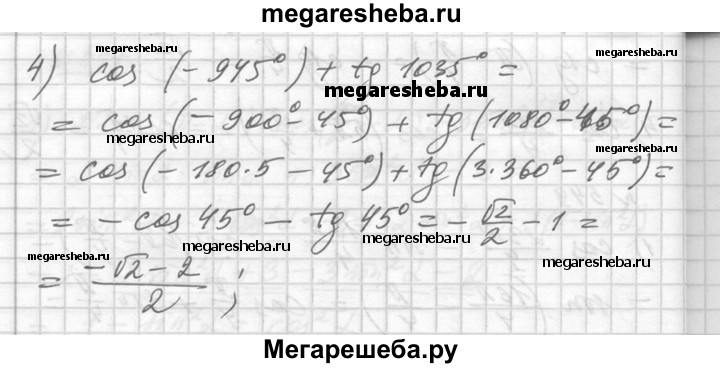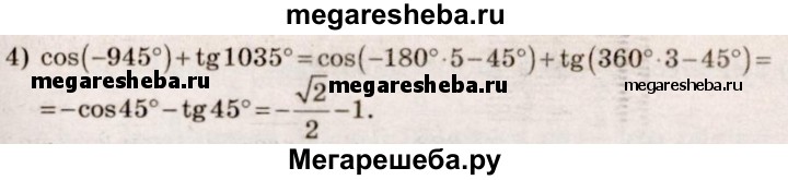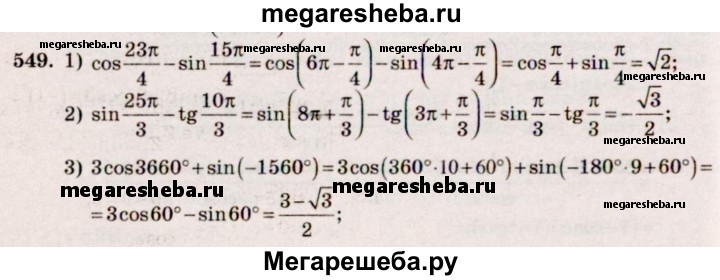 549. 1) cos 23 π /4 – sin 15 π/4; 2) sin 25 π/3 – tg10 π/3; 3) 3 cos 3660° + sin (-1560°); 4) cos (-945°) + tg 1035°.