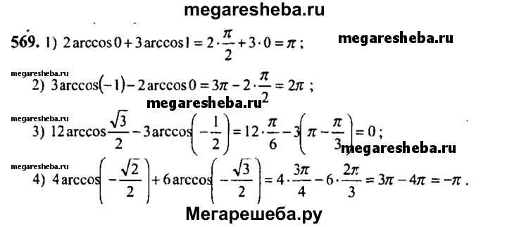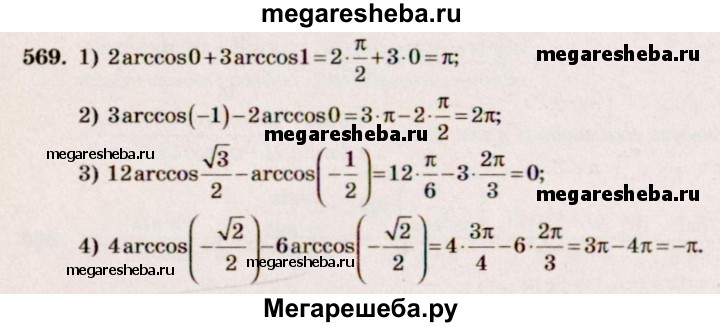 569. 1) 2 arccos 0 + 3 arccos 1; 2) 3 arccos (-1) - 2 arccos 0; 3) 12 arccos √3/2 - 3 arccos (-1/2); 4) 4 arccos (-√2/2) + 6 arccos (-√3/2).