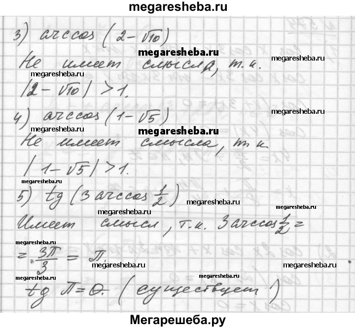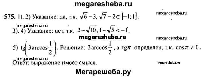 575. Выяснить, имеет ли смысл выражение: 1) arccos (√6-3); 2) arccos (√7 -2); 3) arccos (2 - √10); 4) arccos (1 - √5); 5) tg ( 3 arccos 1/2).