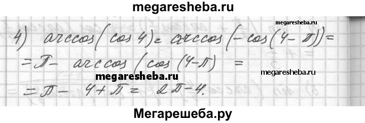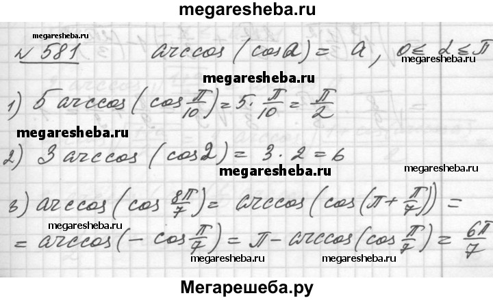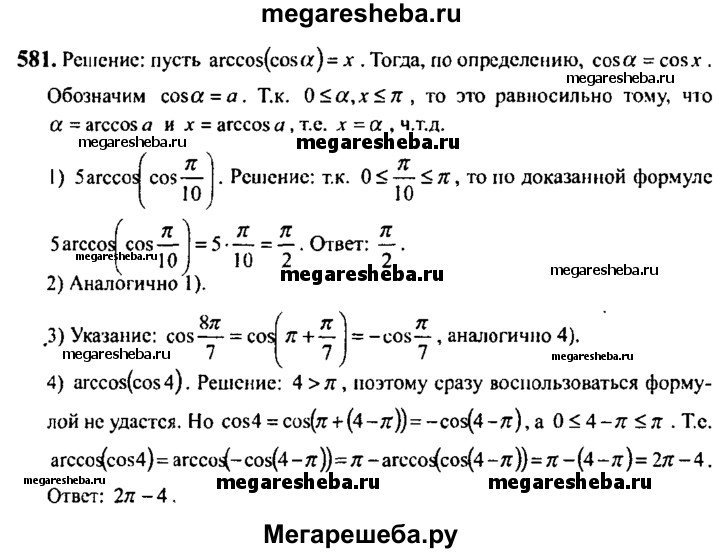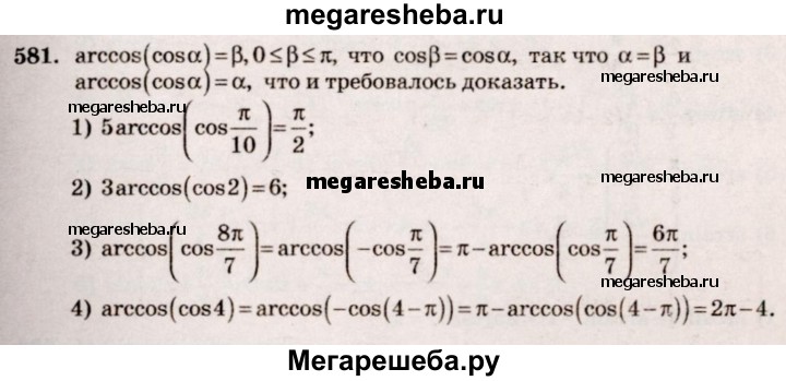581. Доказать, что arccos (cos α) = α при 0 ≤ α ≤ π. Вычислить: 1) 5 arccos (cos π/10); 2) 3 arccos (cos 2); 3) arccos (cos 8π/7); 4) arccos (cos 4).