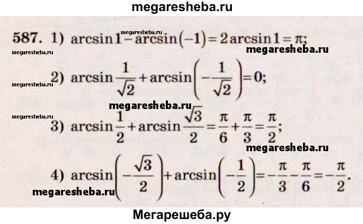 587. 1) arcsin 1 - arcsin (-1); 2) arcsin 1/√2 + arcsin (- 1/√2); 3) arcsin 1/2 + arcsin √3/2; 4) arcsin (-√3/2) + arcsin (- 1/2).