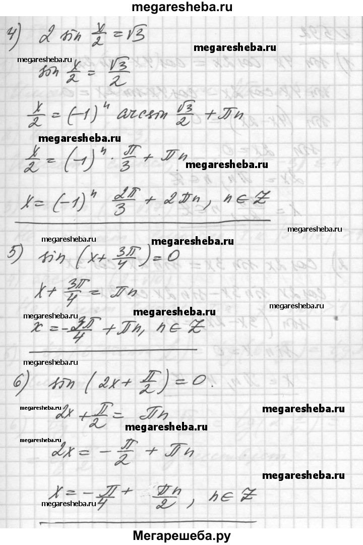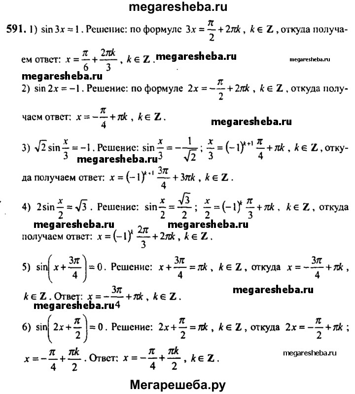 591. 1) sin 3x = 1; 2) sin 2x = -1; 3) √2 sin x/3 = -1; 4) 2sinx/2 = √3; 5) sin (x + 3π/4) = 0; 6) sin (2x + π/2) = 0.