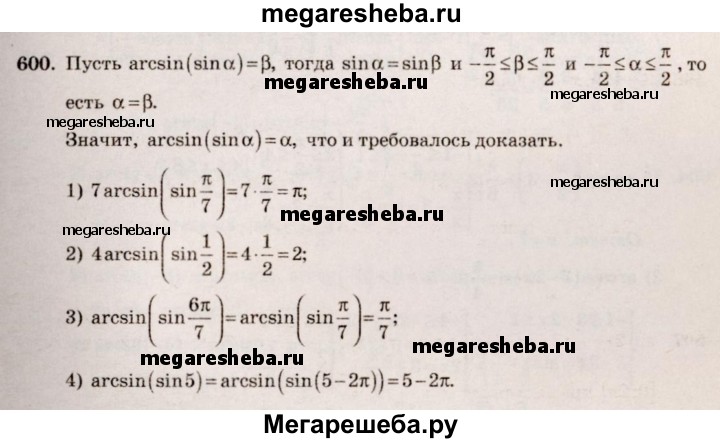 600. Доказать, что arcsin (sin α) = α при – π/2 ≤ α ≤ π/2. Вычислить: 1)7 arcsin (sin π/7); 2) 4 arcsin (sin 1/2); 3) arcsin (sin 6π/7); 4) arcsin (sin5).