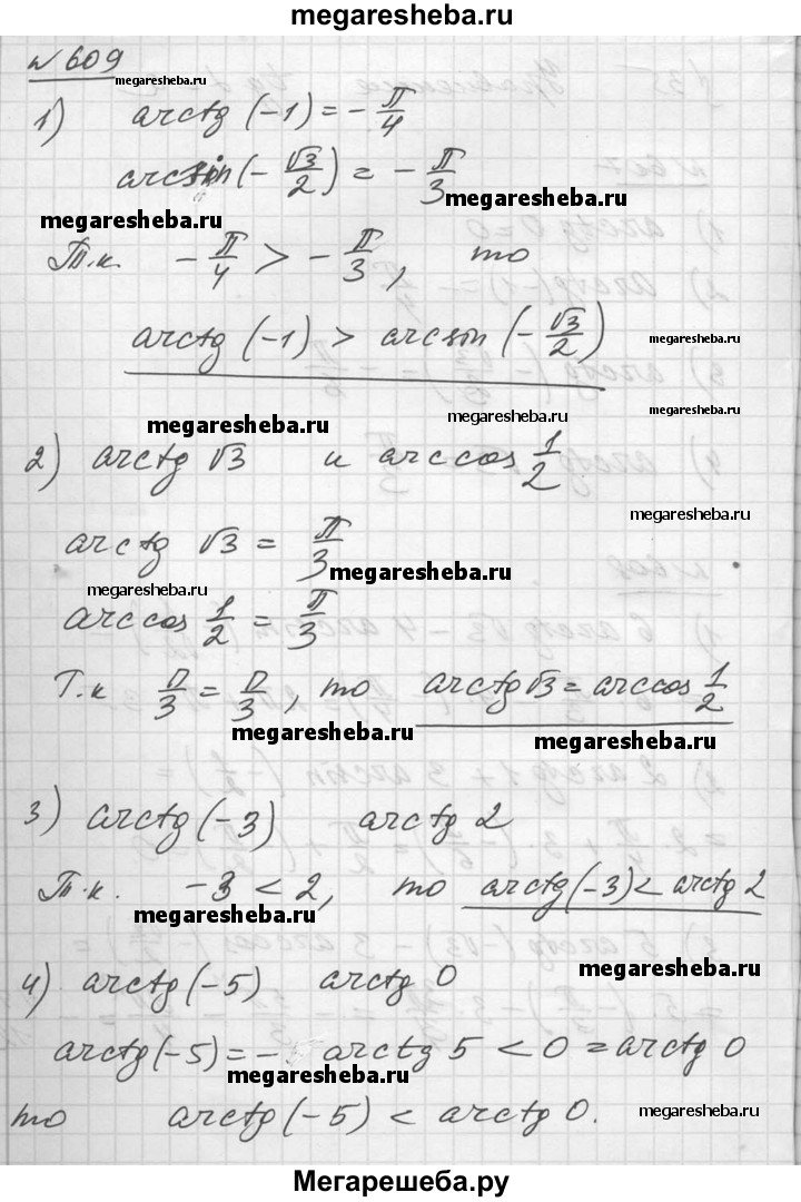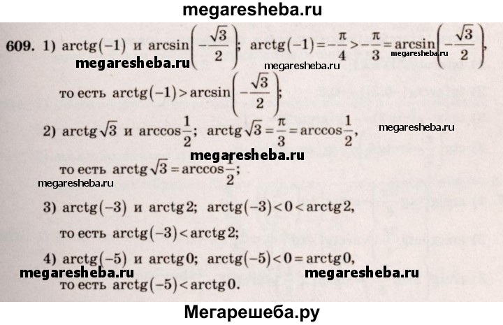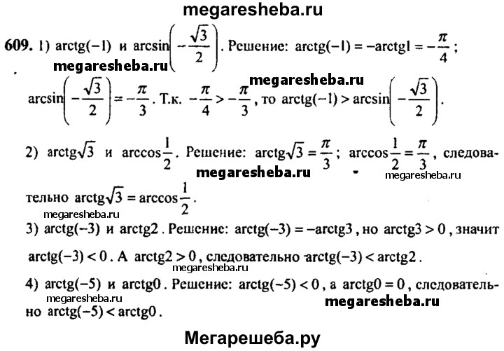609. Сравнить числа: 1) arctg (-1) и arcsin (-√3/3); 2) arctg √3 и arcos 1/2; 3) arctg (-3) и arctg 2; 4) arctg (-5) и arctd 0.