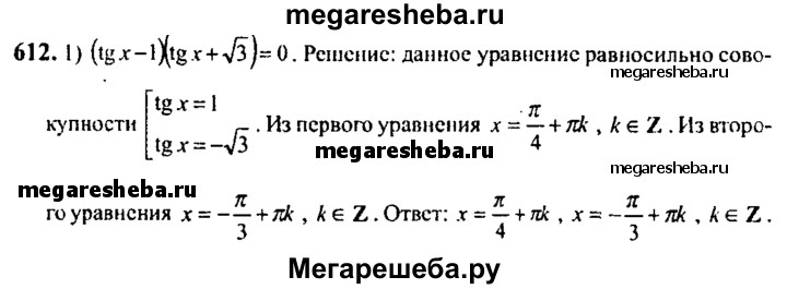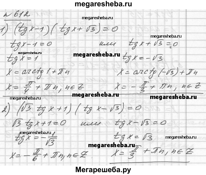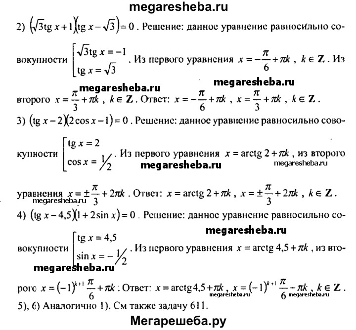 612. 1) (tg x - 1) (tg x + √3) = 0; 2) (√3 tg x+ 1) (tg x - √3) = 0; 3) (tg x – 2) (2 cos x - 1) = 0; 4) (tg x - 4,5) (1 + 2 sin x) = 0; 5) (tgx + 4)(tg x/2 – 1 ) = 0; 6) (tg x/6 + 1)(tgx- 1) = 0.