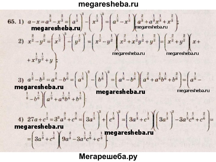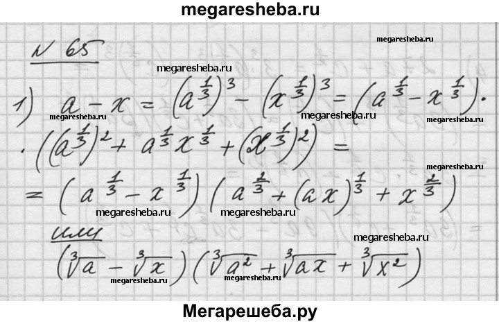 65. Разложить на множители, используя тождество а^3 + b^3 = (a + b) (а^2 - ab + b^2) или а^3 – b^3 = (а - b) (а^2 + ab + b^2):