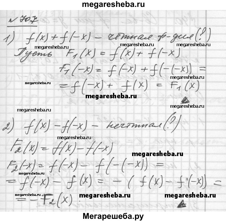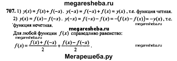 707. Пусть функция f (х) определена на всей числовой прямой. Доказать, что: 1) f (х) + / (-х) — чётная функция; 2) f (х) - / (-х) — нечётная функция.
