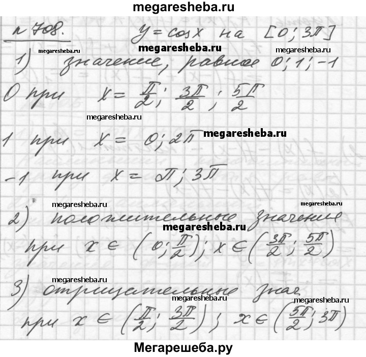 708. (Устно.) Выяснить, при каких значениях х, принадлежащих отрезку [0; Зπ], функция у = cos х принимает: 1) значение, равное 0, 1, - 1; 2) положительные значения; 3) отрицательные значения.