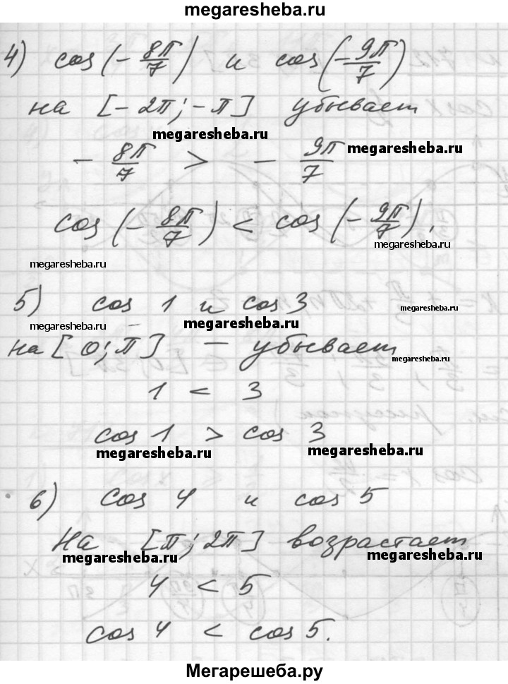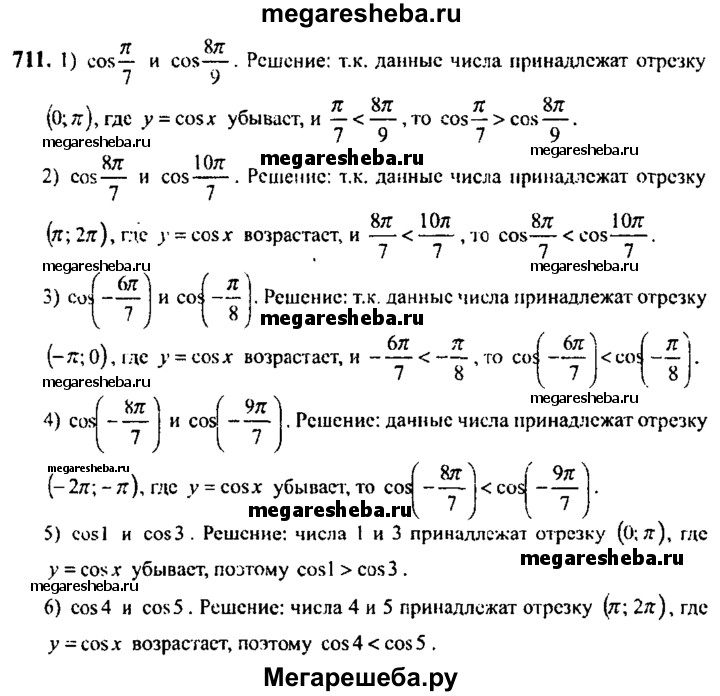 711. Используя свойство возрастания или убывания функции у = cos х, сравнить числа: 1) cos π/7 и cos 8π/9; 2) cos 8π/7 и cos 10π/7; 3) cos(- 6π/7) и cos(-π/8); 4) cos (- 8π/7) и cos (- 9π/7); 5) cos 1 и cos 3; 6) cos 4 и cos 5.
