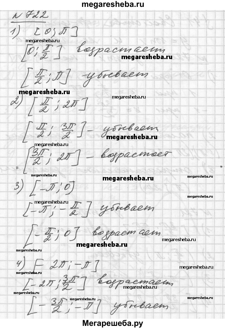 722. Разбить данный отрезок на два отрезка так, чтобы на одном из них функция у = sin х возрастала, а на другом убывала: 1) [0; π]; 2) [π/2; 2π;] 3) [-π; 0]; 4) [-2 π; - π].