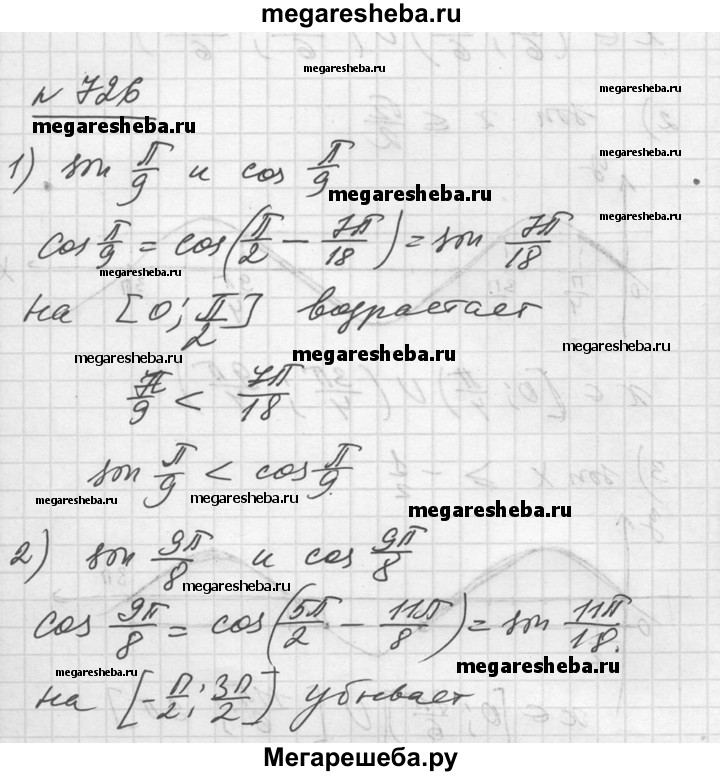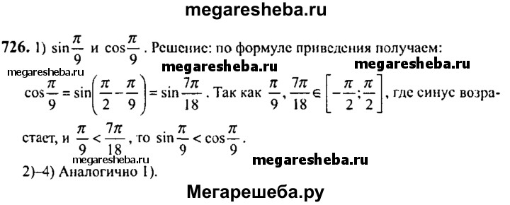 726. Выразив косинус через синус по формулам приведения, сравнить числа: 1) sin π /9 и cos π/9; 2) sin 9 π/8 и cos 9π/8; 3) sin π/5 и cos 5π/14; 4) sin π/8 и cos 3π/10.