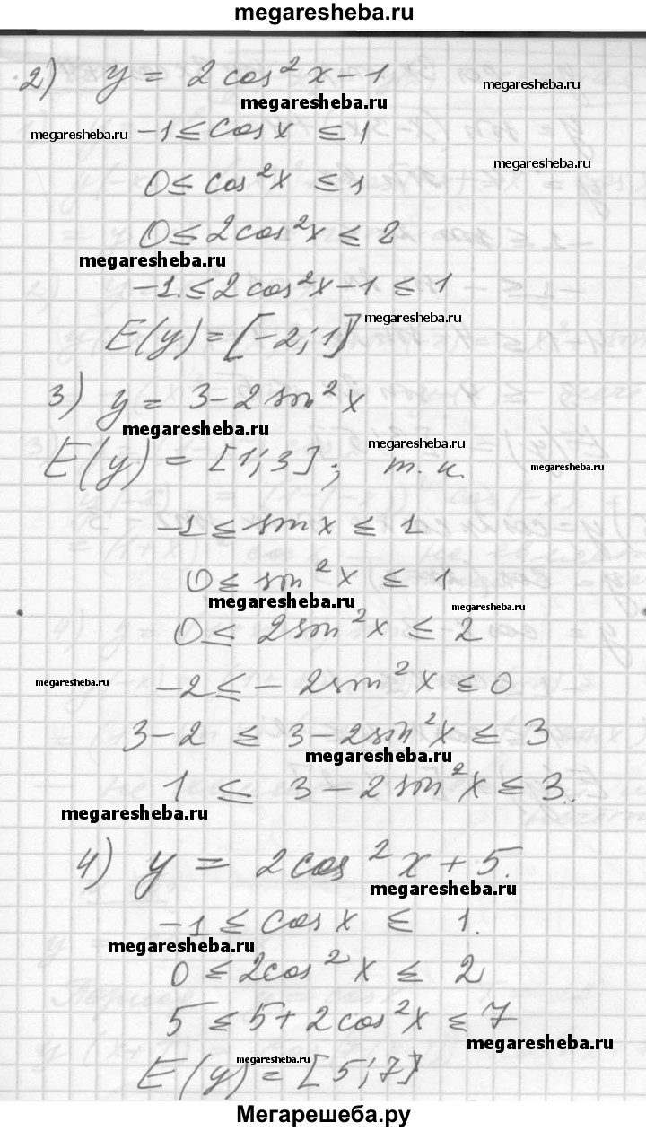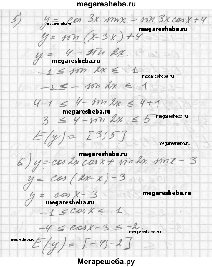 759. Найти множество значений функции: 1) у = 1 - 2 sin^2 х; 2) у = 2 cos^2 х-1; 3) у = 3 - 2 sin^2 х; 4) у = 2 cos^2 х + 5; 5) у = cos Зх sin х - sin Зх cos х + 4; 6) у = cos 2х cos х + sin 2х sin х - 3.