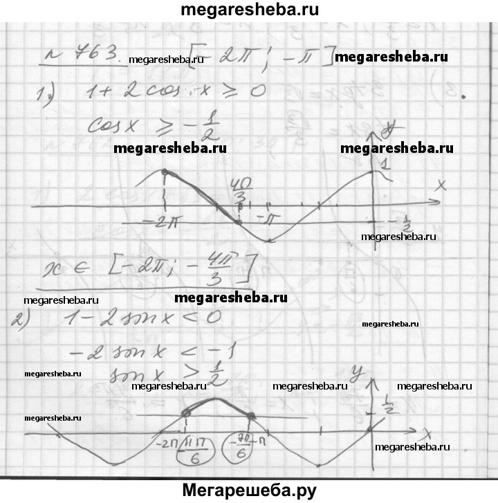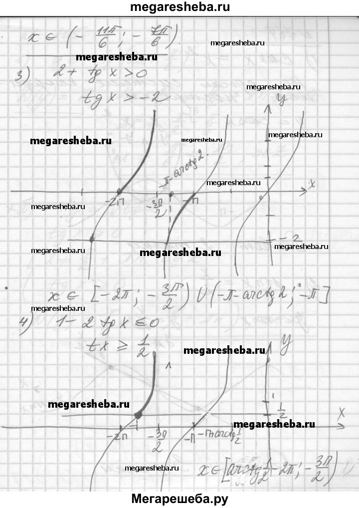 763. Найти все решения неравенства, принадлежащие промежутку [-2π; -π]: 1) 1 + 2 cos х ≥ 0; 2) 1 - 2 sin х < 0; 3) 2 + tg х > 0; 4) 1 - 2 tg х ≤ 0.