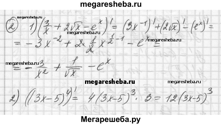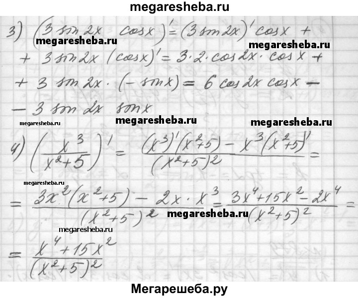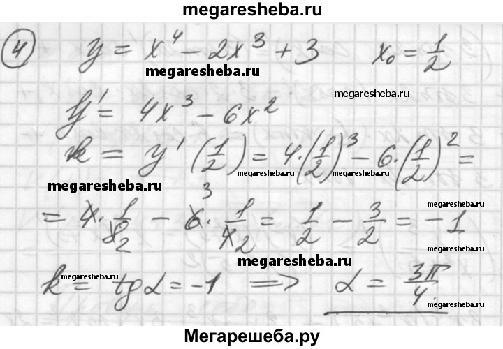 1. Найти значение производной функции f (х) = Зх^3 + 4х - 1 в точке х = 3. 2. Найти производную функции: 1) 3/x + 2 √х – е^х; 2) (Зх - 5)^4; 3) 3 sin 2х cos х; 4) x^3 / x^2+5. 3. Найти угловой коэффициент касательной к графику функции у = cos Зх в точке с абсциссой х0 = π/6. 4. Найти угол между касательной к графику функции у = х^4 - 2х^3 + 3 в точке с абсциссой х0 = 1/2 и осью Ох.