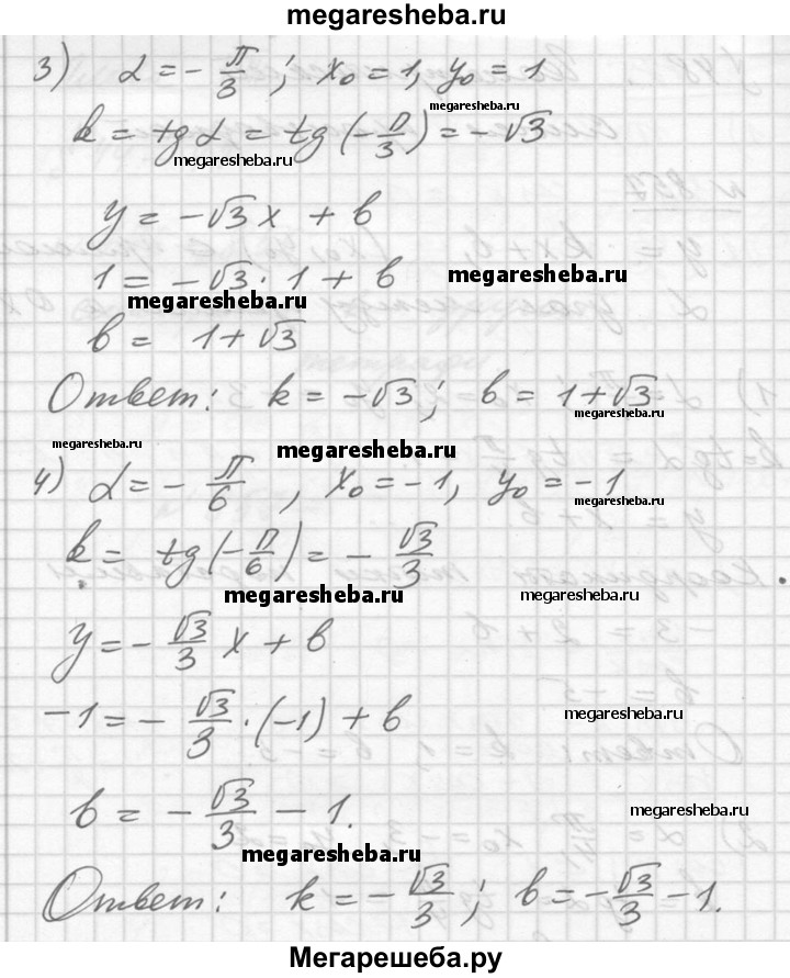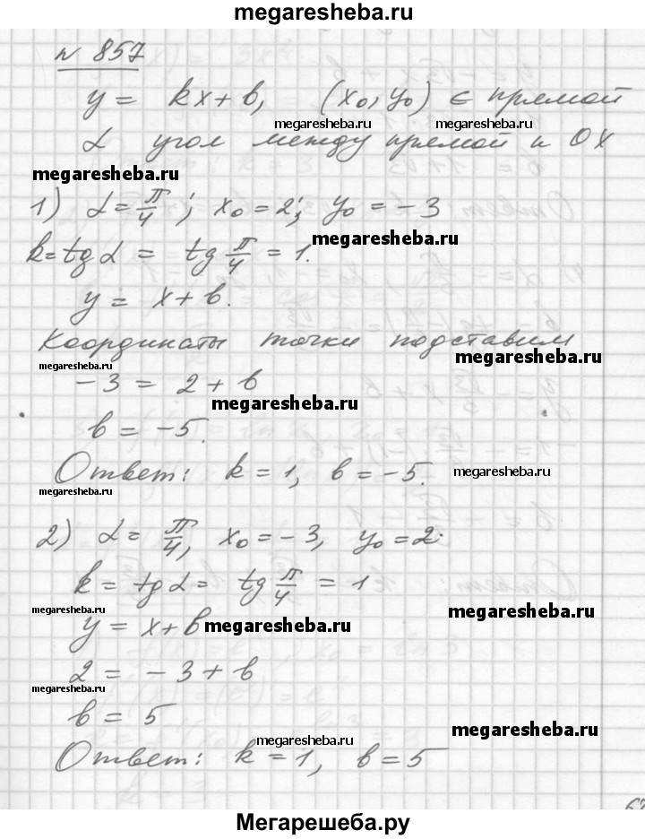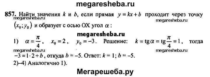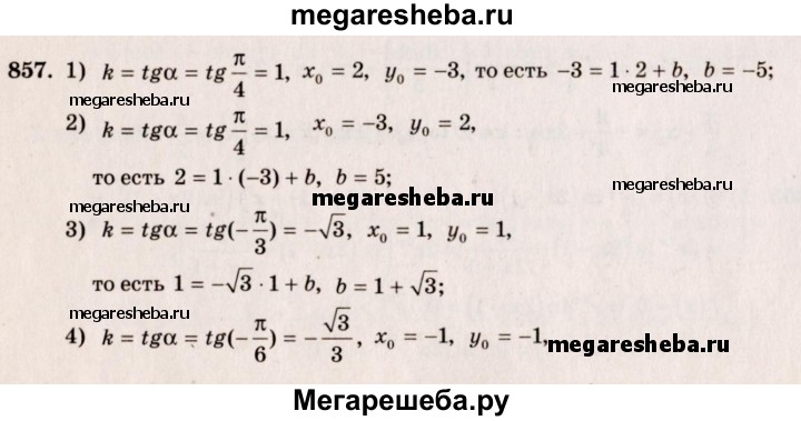 857. Найти значения k и b, если прямая у = kx + b проходит через точку (х0; у0) и образует с осью Ох угол α: 1) α = π/4, х0 = 2, у0 = -3; 2) α = π/4; х0 = -3, у0 = 2; 3) α = - π/3, х0 = 1, у0 = 1; 4) α = - π/6, х0 = -1, у0 = -1.