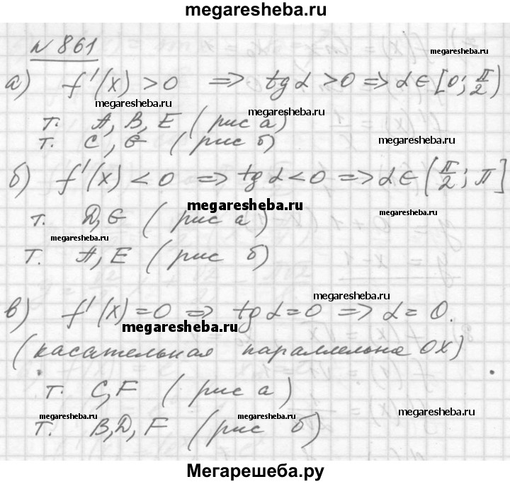 861. Функции y = f (x) задана своим графиком. Из точек A, B, C, D, E, F, G выбрать те, в которых производная этой функции принимает: А) положительные значения; Б) отрицательные значения; В) значения, равные 0.