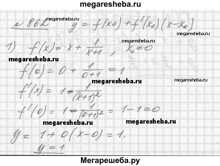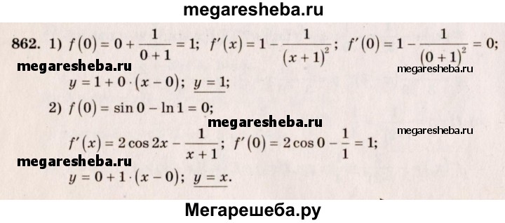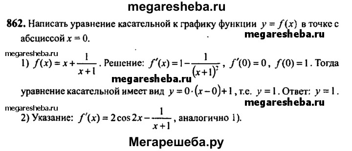 862. Написать уравнение касательной к графику функции у = f (х) в точке с абсциссой х = 0: 1) f (х) = х + 1/x+1; 2) f (х) = sin 2х - In (х + 1).