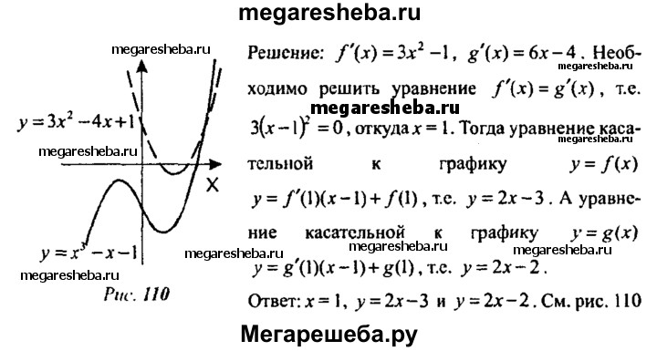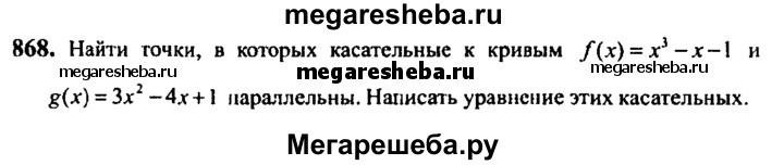 868. Найти точки, в которых касательные к кривым f (х) = х^3 - х - 1 и g (х) = Зх^2 - 4х + 1 параллельны. Написать уравнения этих касательных.