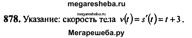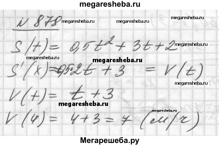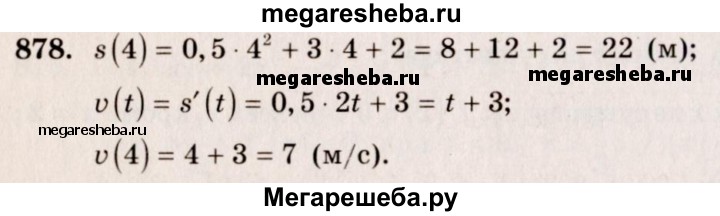 878. Закон движения тела задан формулой s (t) = 0,5t^2 + 3t + 2 (s — в метрах, t — в секундах). Какой путь пройден телом за 4 с? Какова скорость движения в этот момент времени?