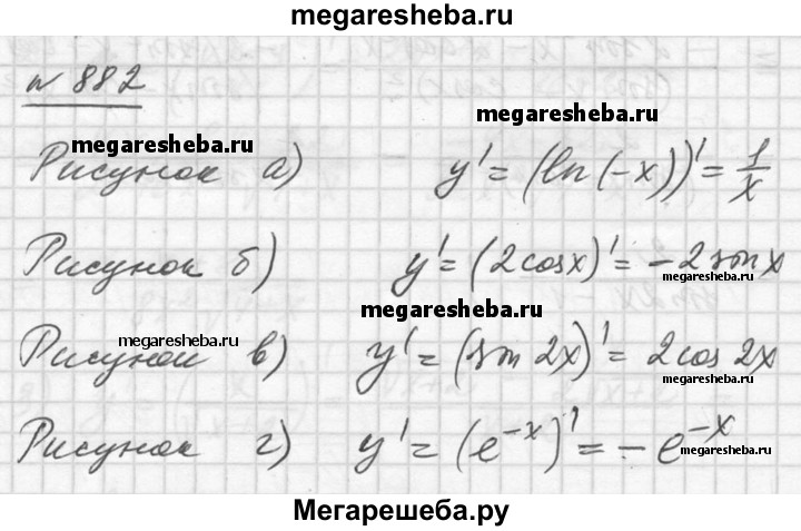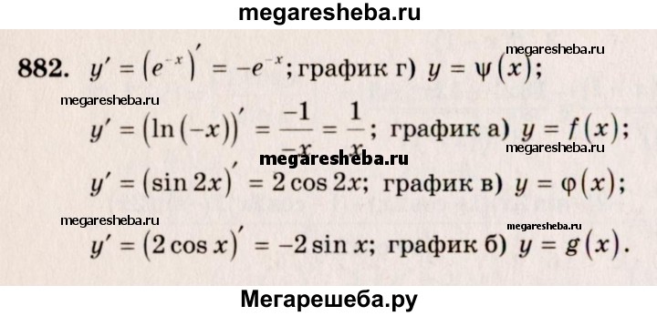 882. На каком из рисунков 119 (a—г) изображены эскизы графиков функций, являющихся производными следующих функций: у = е^-х, у = In (-х), у = sin 2х, у = 2 cos х?