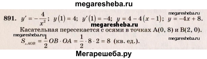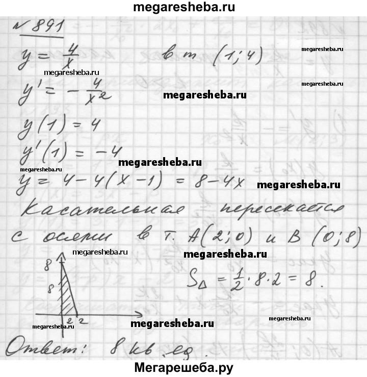 891. Прямая касается гиперболы у = 4/x в точке (1; 4). Найти площадь треугольника, ограниченного этой касательной и осями координат.